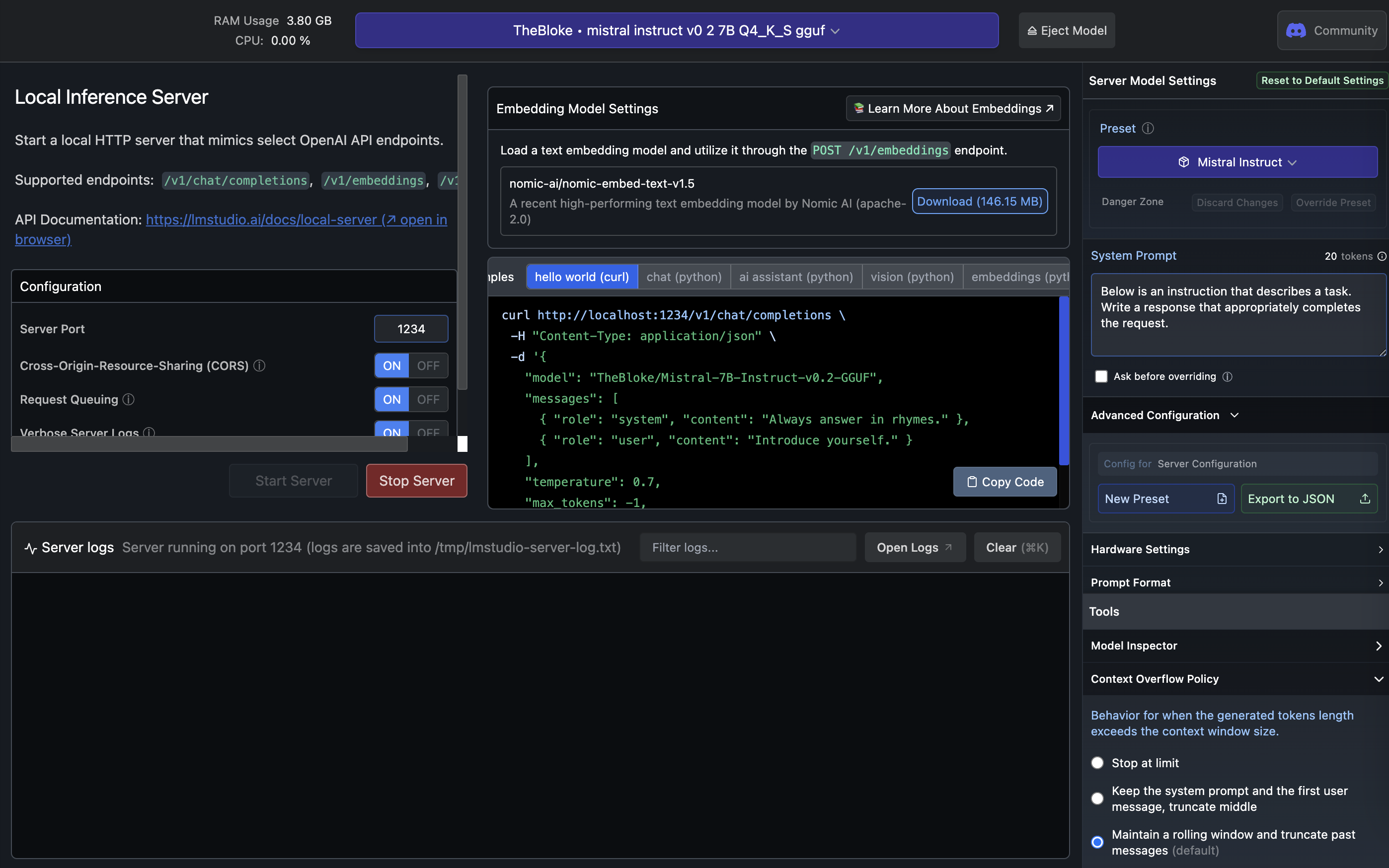The above picture shows Mistral instruct v0.2 running on my local server. Once you have this running, you can use it within Obsidian.