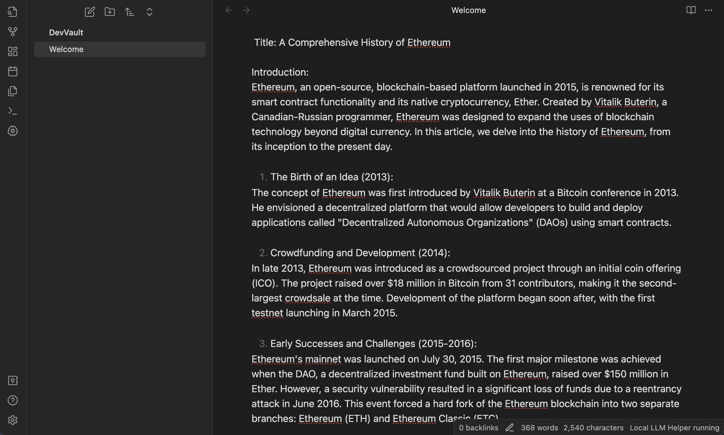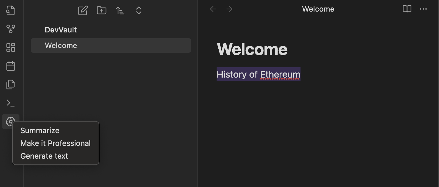 All of these options take the 'selected text' as input and replace it with the corresponding output. Let's generate some text now. Below, I select 'History of Ethereum' and click Generate Text.